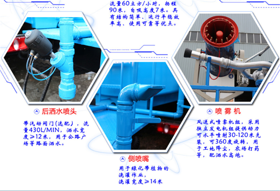 • 噴霧抑塵車:用于鐵路煤炭運輸煤揚塵污染防治,也廣泛用于其它散裝物料運輸過程防揚塵污染以及渣料場、儲煤場、建筑工地、汽車運煤揚塵、固沙、鋼鐵建材、水泥、企業各種露天料場生態護坡等方面。同時具備灑水車功能,在噴灑作業時可實現360度旋轉,后平臺高炮可同時進行旋轉,并可電子遙控操作,射程25-120米均有。