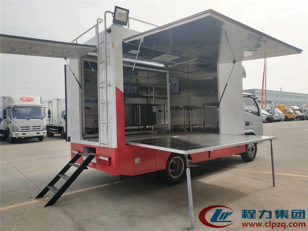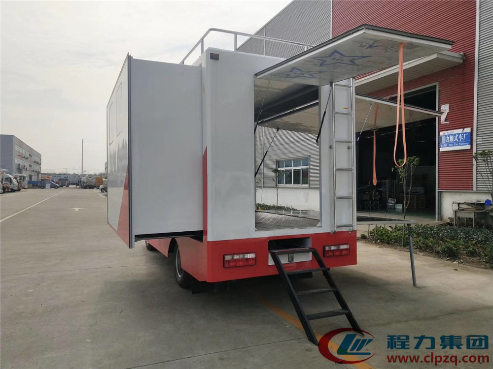 其他 車輛顏色可選,文字噴涂位置可變化,車廂頂部選裝天窗、排煙罩,排氣口,護欄,水箱,車輛顏色可選,文字噴涂位置可變化,車廂頂部選裝天窗、排煙罩,排氣口,護欄,水箱,護欄;整車外觀噴涂或粘貼宣傳標識;廂內內部設備可根據用戶要求定制如發電機,冰柜,冷飲機,售貨臺,炊具等;左側右側后側選裝不同結構形式的側翻門、吧臺、舞臺、遮陽板、裝玻璃窗、亦可選裝LED屏舉升或者不舉升;前部選裝水箱;后部選裝LED屏,或者選裝百葉窗,爬梯,或者上翻或者側翻門;隨底盤選裝駕駛室。ABS廠家及型號:襄陽東風隆誠機械有限責任公司/ABS/ASR-24V-4S/4M.