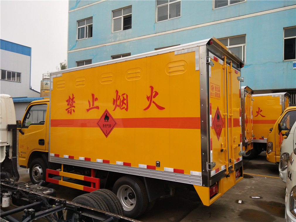 4mm厚的鋼板制作,廂體底部鋪有防靜電膠皮,廂體兩側安裝固定貨物卡槽或臥環,廂體頂部中間位置安裝煙霧報警器,后門及側門安裝防盜報警器,廂體前面鋪靜電膠皮,帶側門,后雙門,廂體顏色根據客戶要求變換,帶兩只滅火器和排氣管防火罩、三角危險品頂燈,其余標配。