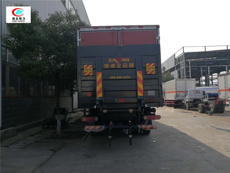4mm厚的鋼板制作,廂體底部鋪有防靜電膠皮,廂體兩側安裝固定貨物卡槽或臥環,廂體頂部中間位置安裝煙霧報警器,后門及側門安裝防盜報警器,廂體前面鋪靜電膠皮,帶側門,后雙門,廂體顏色根據客戶要求變換,帶兩只滅火器和排氣管防火罩、三角危險品頂燈,其余標配。
