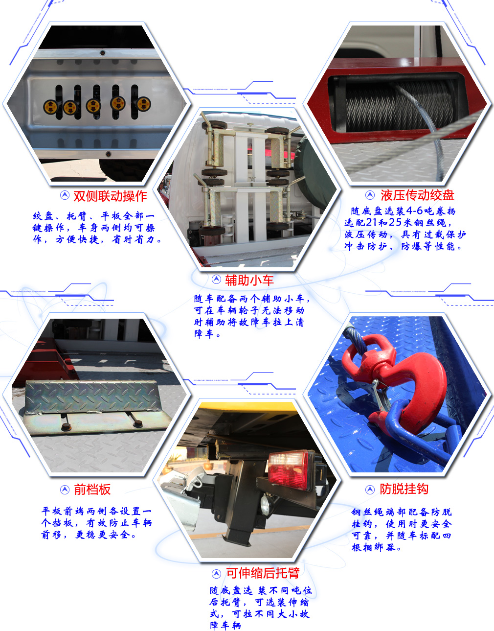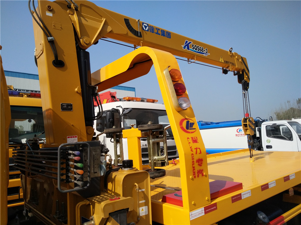 整車配置:朝柴156馬力/玉柴150馬力,六檔箱,825R16鋼絲胎,斷氣剎,4.4米軸距,ABS,配3.2或4噸吊機,2.5噸后托臂,5米鋼絲繩,雙側聯動操作,有花紋板及壓制板可選,配輔助小車一套,黃色電子警燈,四根捆綁器。