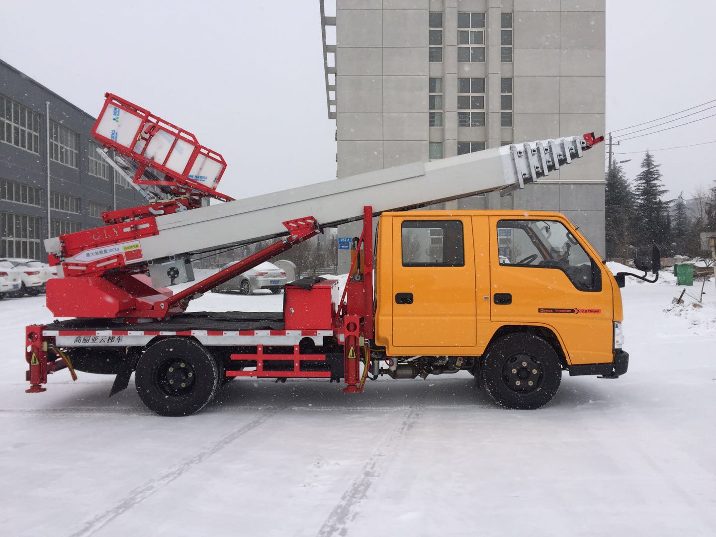 江鈴順達雙排云梯搬家作業車,可以實現平臺載荷300kg,最大作業高度28-33米,最大作業幅度13米。工作平臺1100×1000×450(mm),七節同步伸縮,180度回轉,H型,二節伸縮支腿,單獨可調,工作平臺和地面遙控器電氣操作,轉臺液壓操作,液壓自動調平。立式減速機,雙向平衡閥帶無極調速,電控操作。