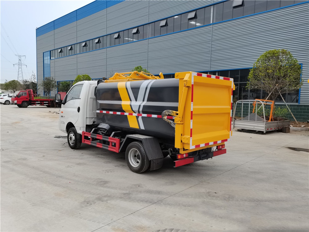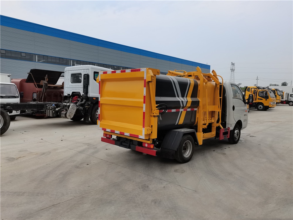 側裝式壓縮垃圾車屬于自裝卸式垃圾車的一種,采用側提桶上料方式進行生活垃圾收集,采用推板推擠或自卸式進行卸料。主要結構:汽車底盤、垃圾廂體、底架、側提桶機構、后門總成、推板總成、液壓系統和電控系統。液壓及電控系統由油泵、油缸、油箱、電液控制閥、PLC和控制開關等組成。同時本車自重輕,箱體為圓弧形,容積大,同等車型中裝載量最大,并且美觀大方。